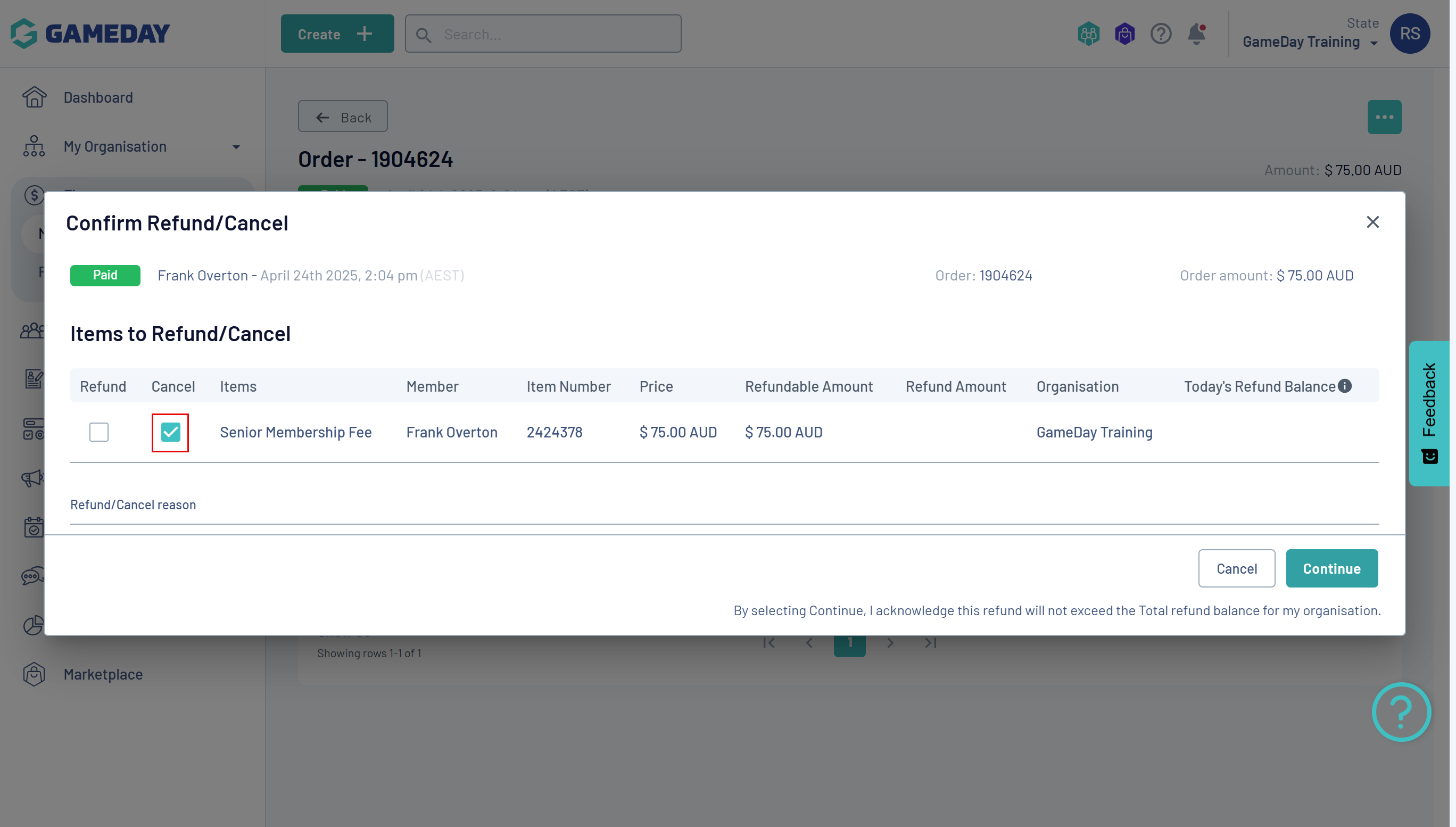 If an existing member has a paid or unpaid order listed against their name in your GameDay database, you can cancel the order.