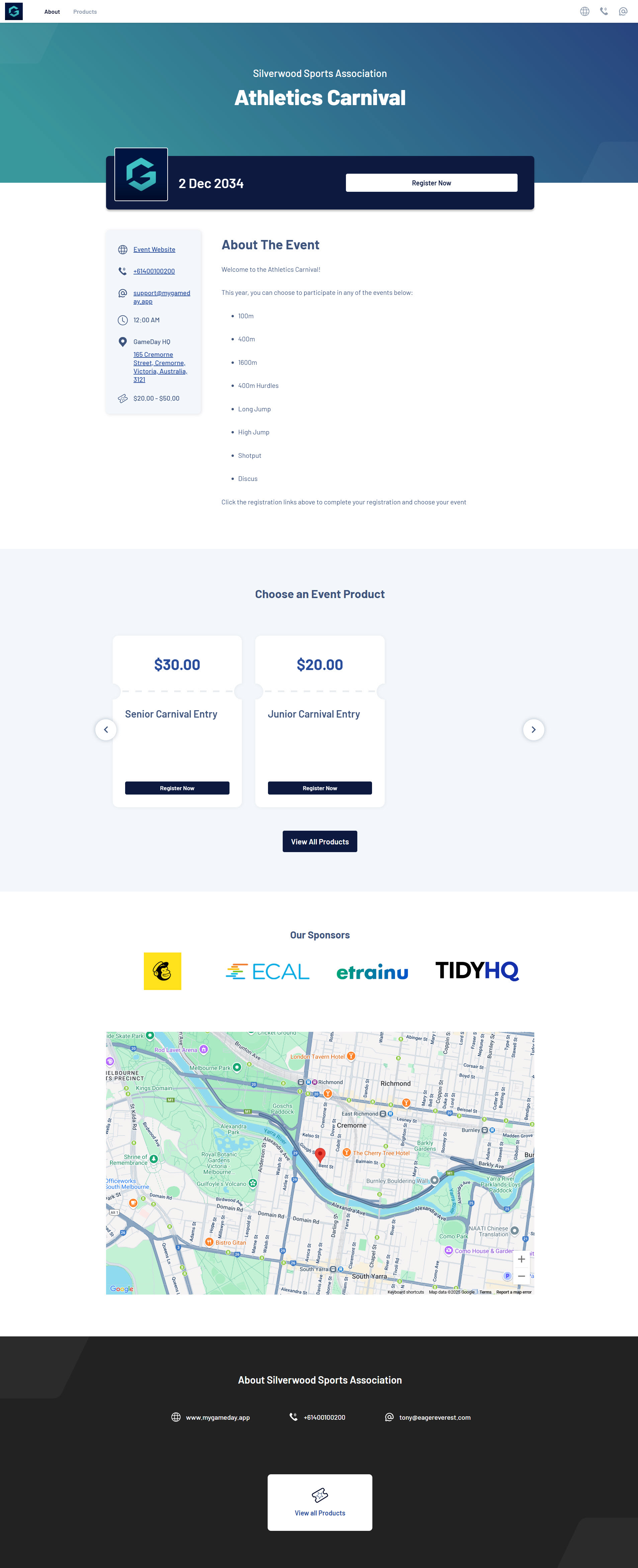 Each event comes with an in-built Landing Page and Registration Form that you can customise and publish to allow entrants to see event details, prices, key contacts and to register and pay online.