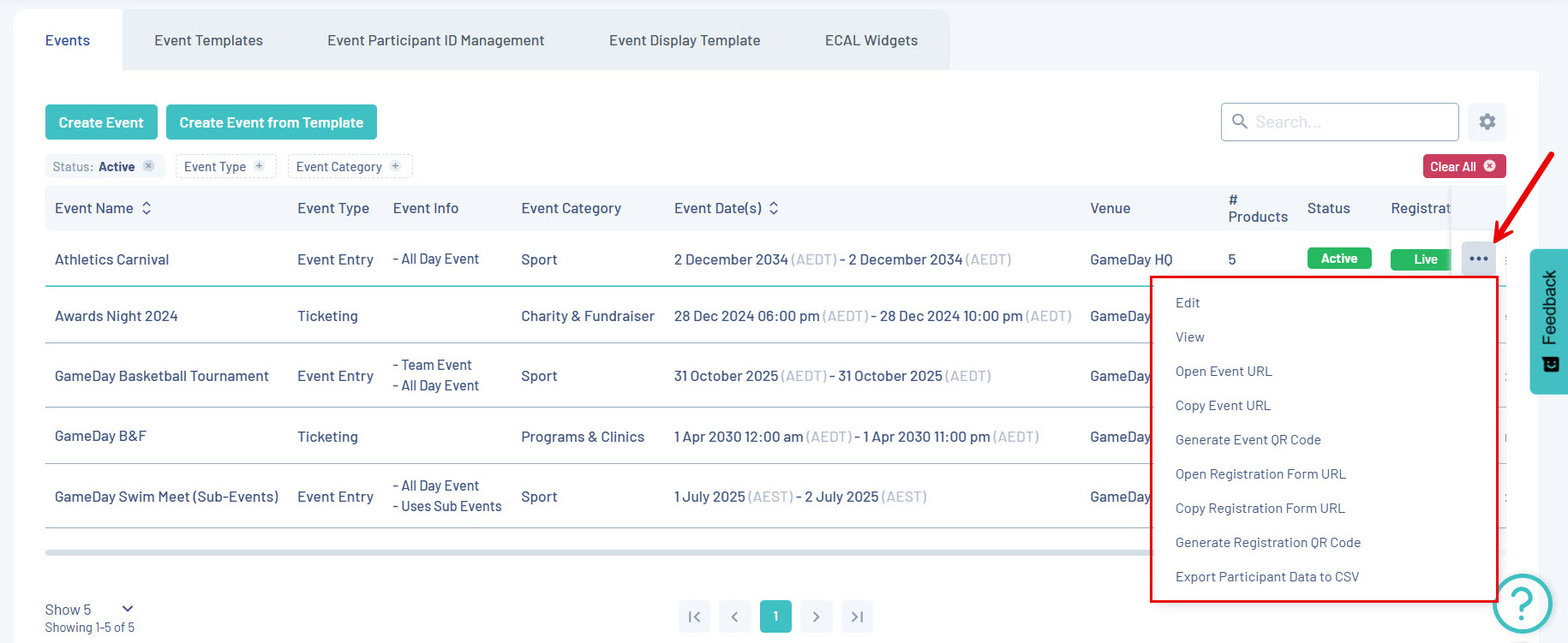 6. Actions: Expand the actions arrow to edit, view or access various event settings, including: