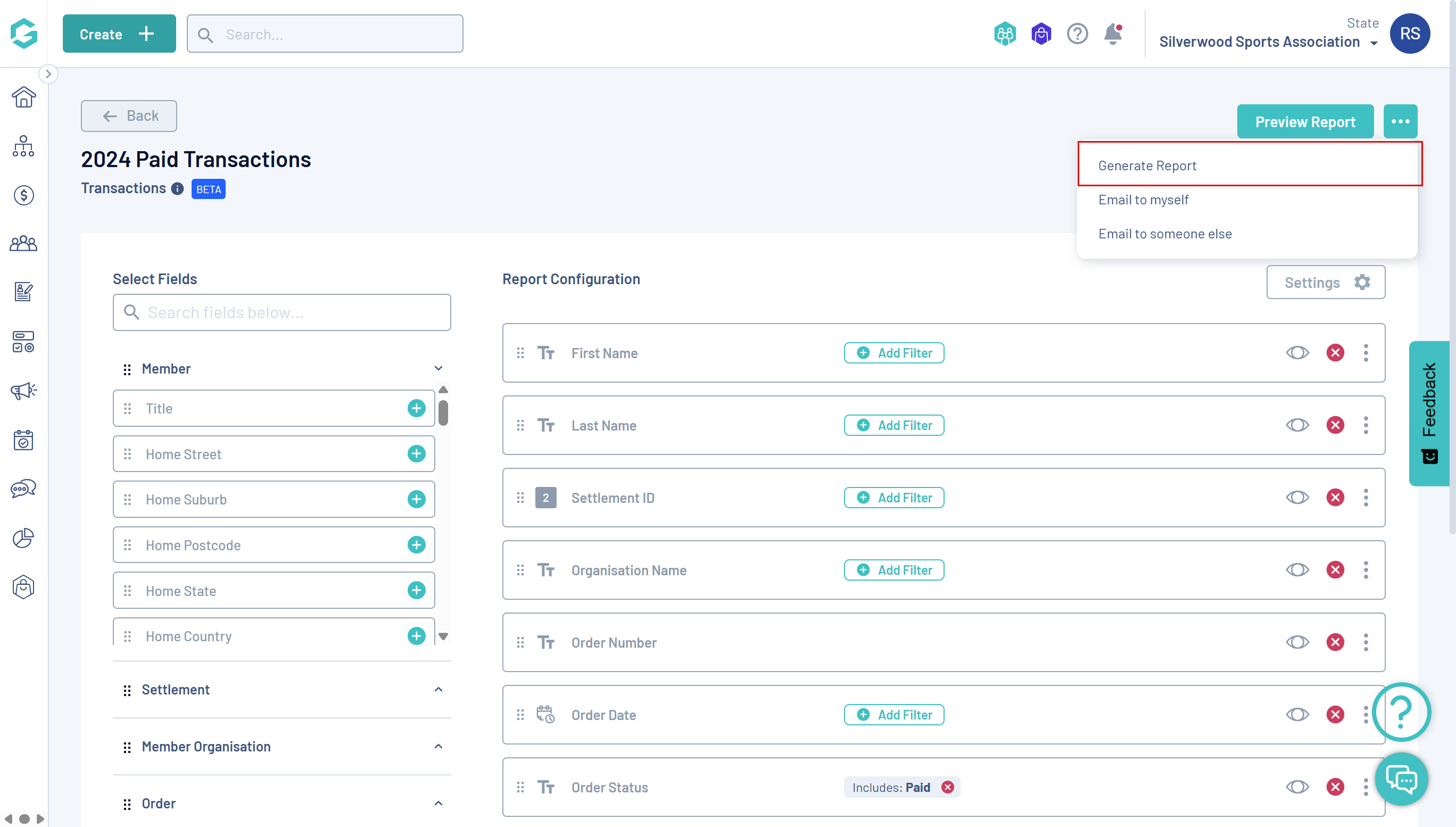 When you've got the report configure the way you want it, you can export the report data to a CSV file by selecting GENERATE REPORT under the three dots menu