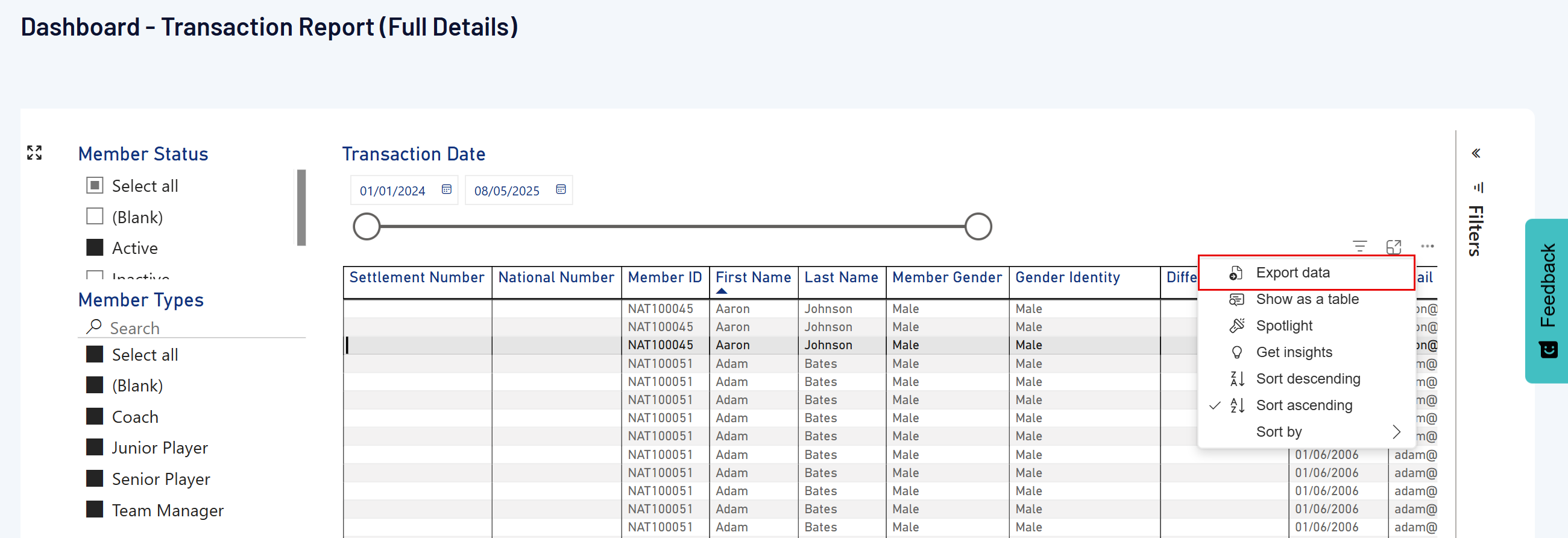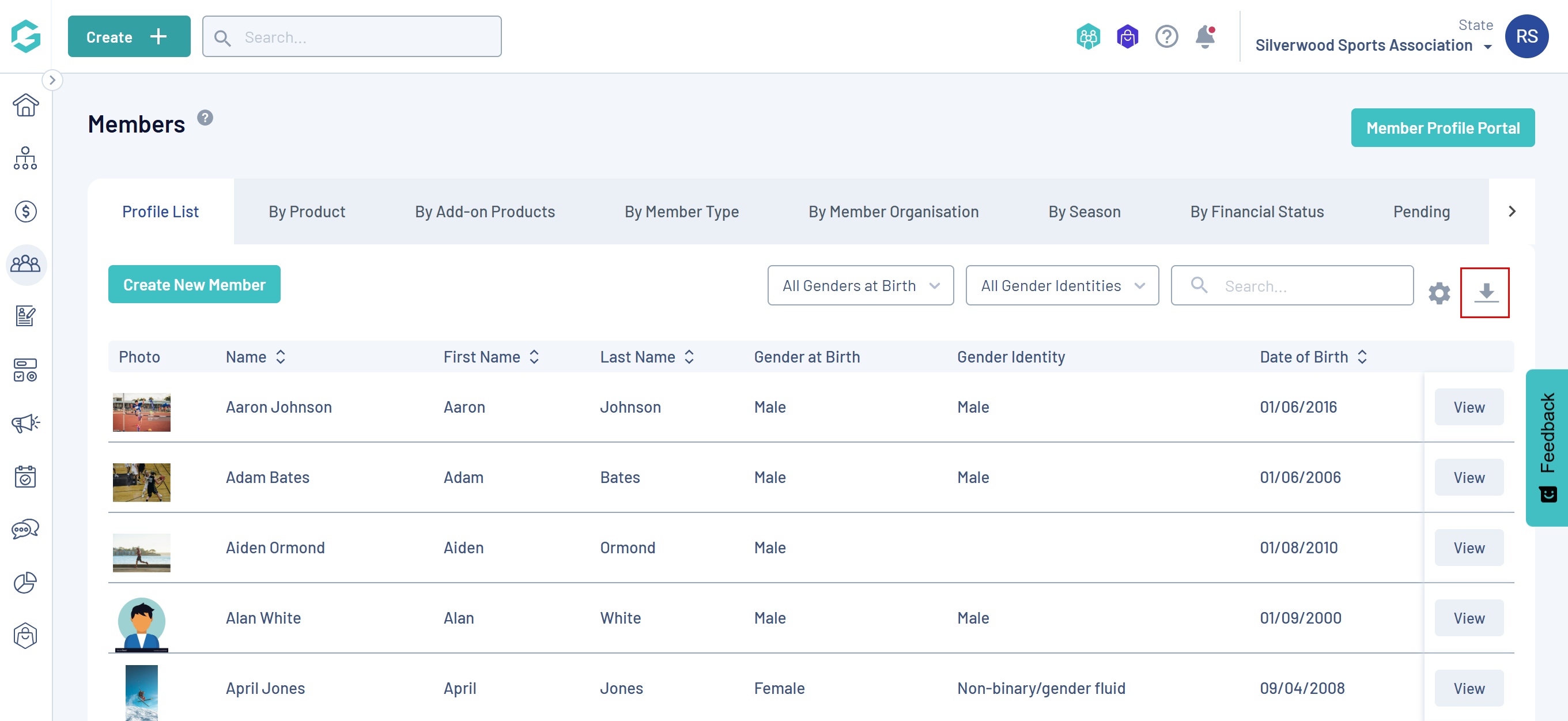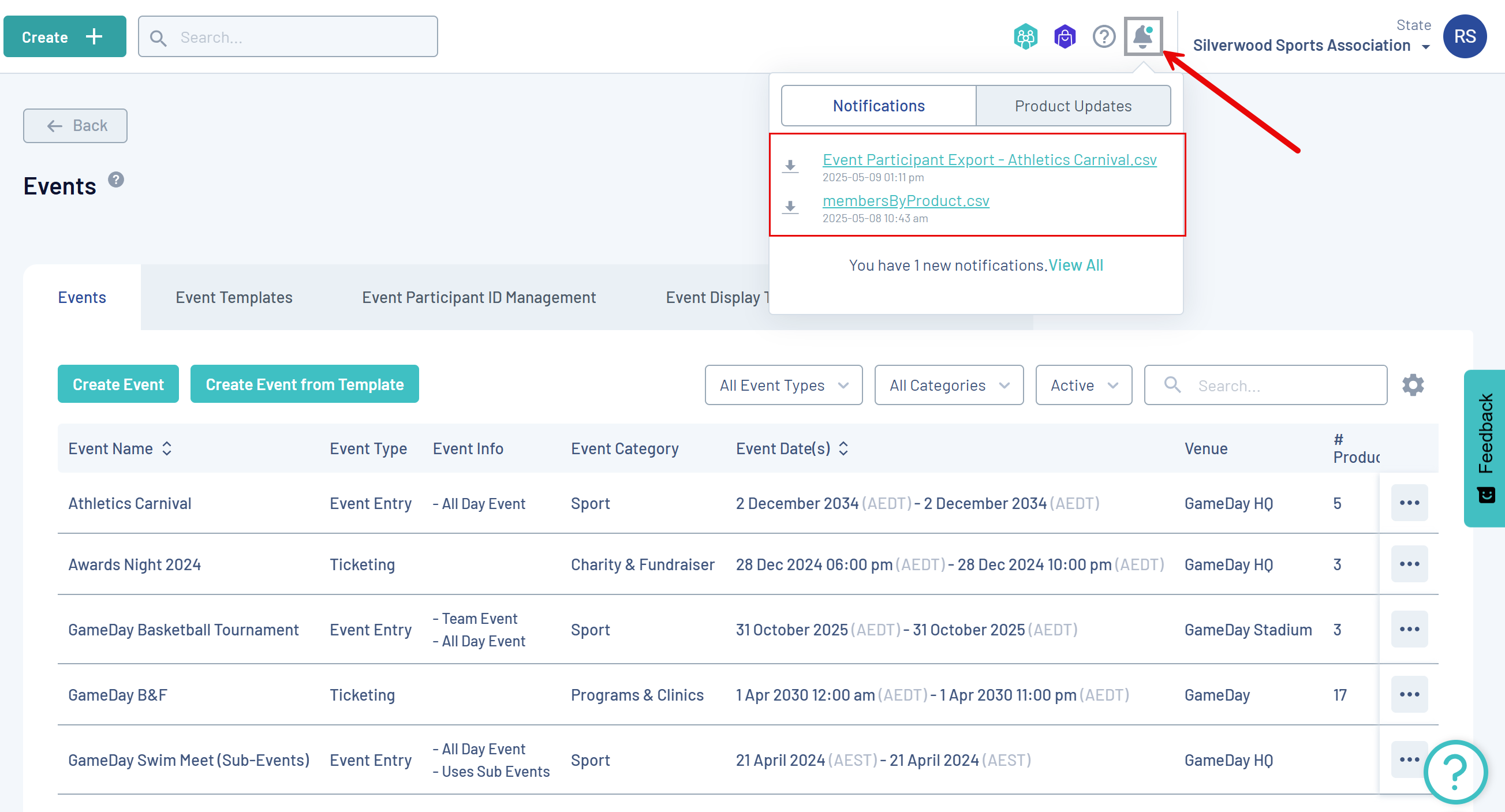 Any list you find while navigating around GameDay can also be exported. Examples of list pages you might find are the member profile list and each of its different displays, event participant lists, orders, settlements or accreditations.