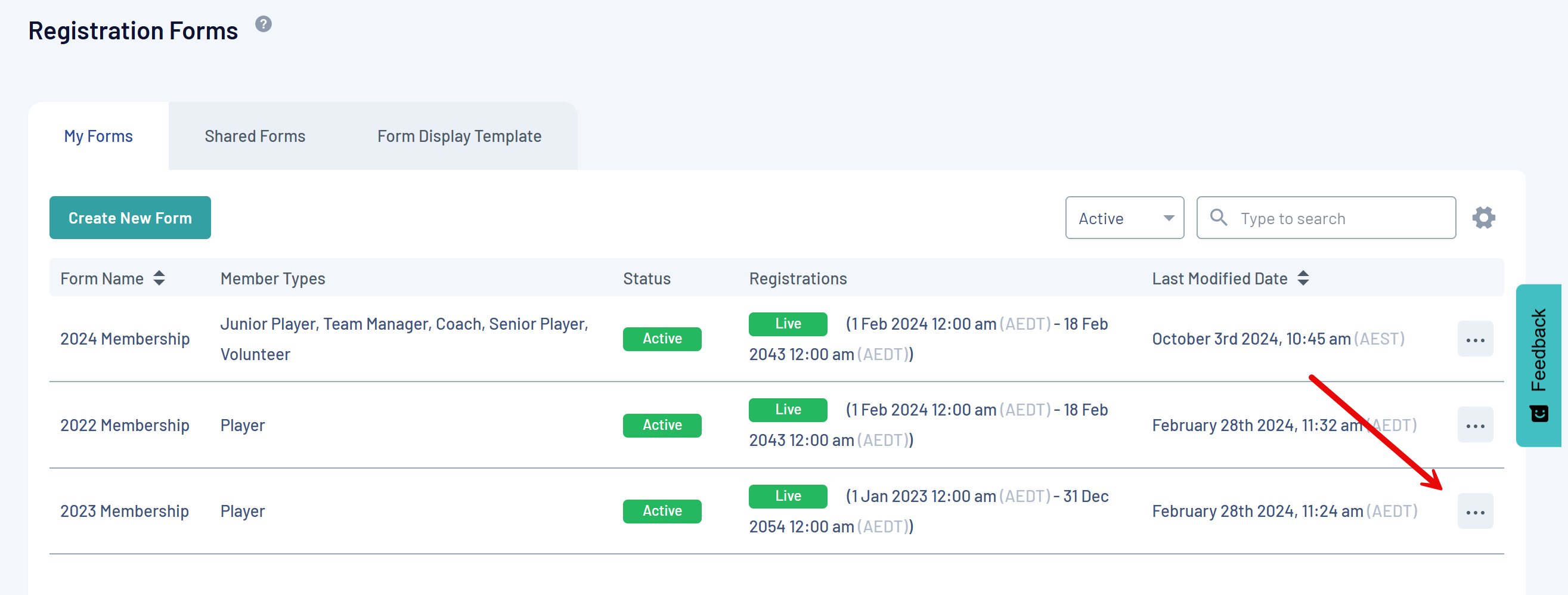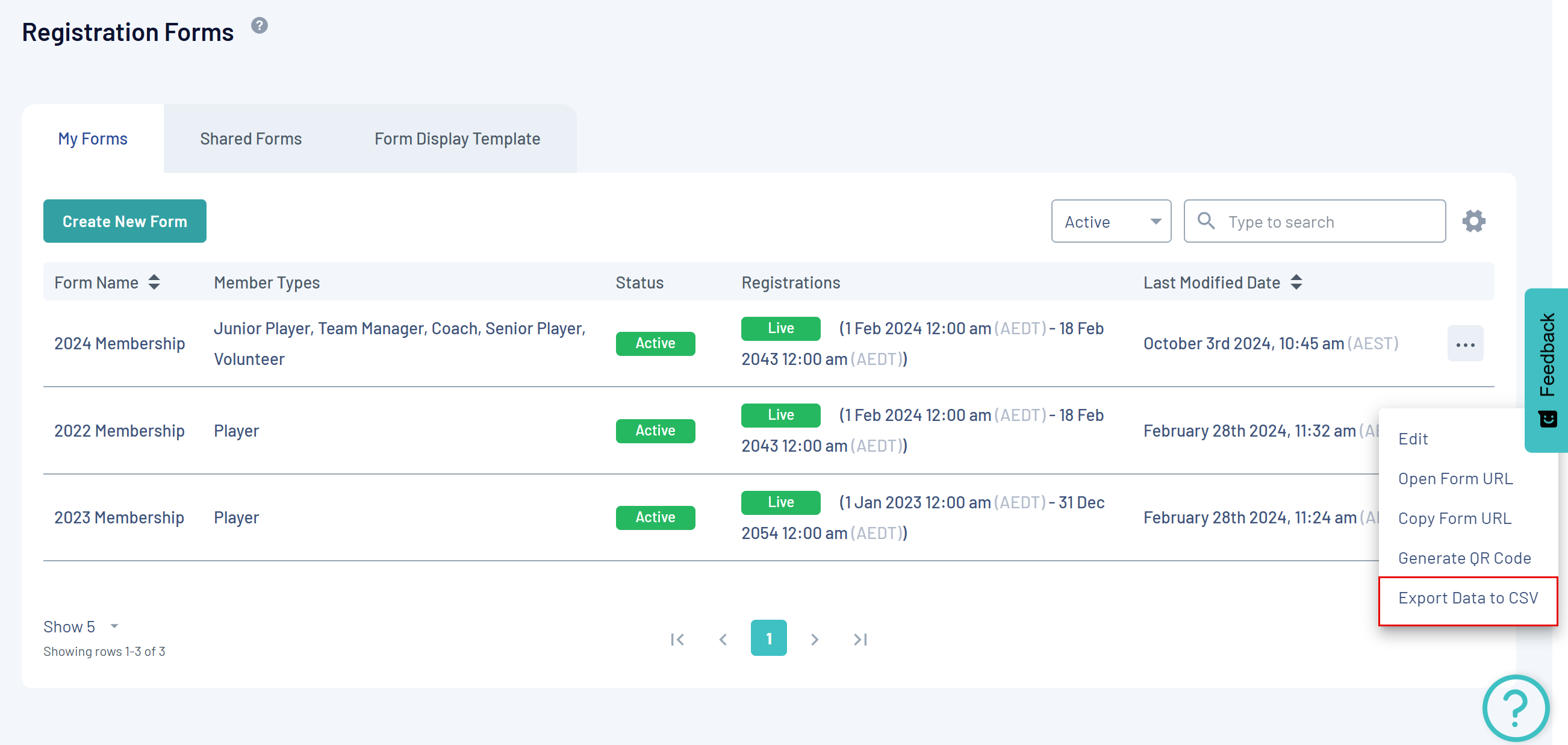 On the Membership Forms page, you can export form data by opening the three dots menu on the right hand side of the specific form, then selecting EXPORT DATA TO CSV