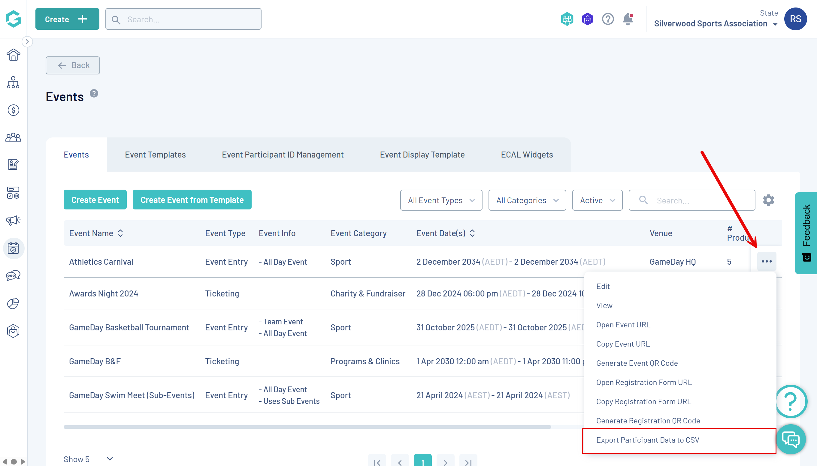 Likewise, on the Manage Events page, you can follow the same process to export data from event registrations.
