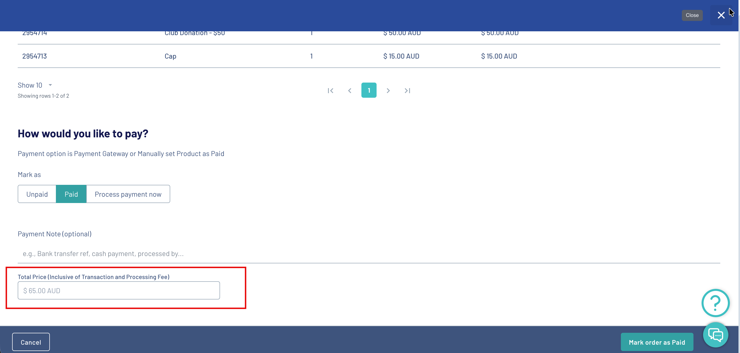 NOTE: For orders paid offline, select "Paid" in Step 4 of the process. Users can then enter an optional payment note to support record-keeping and reporting within the system