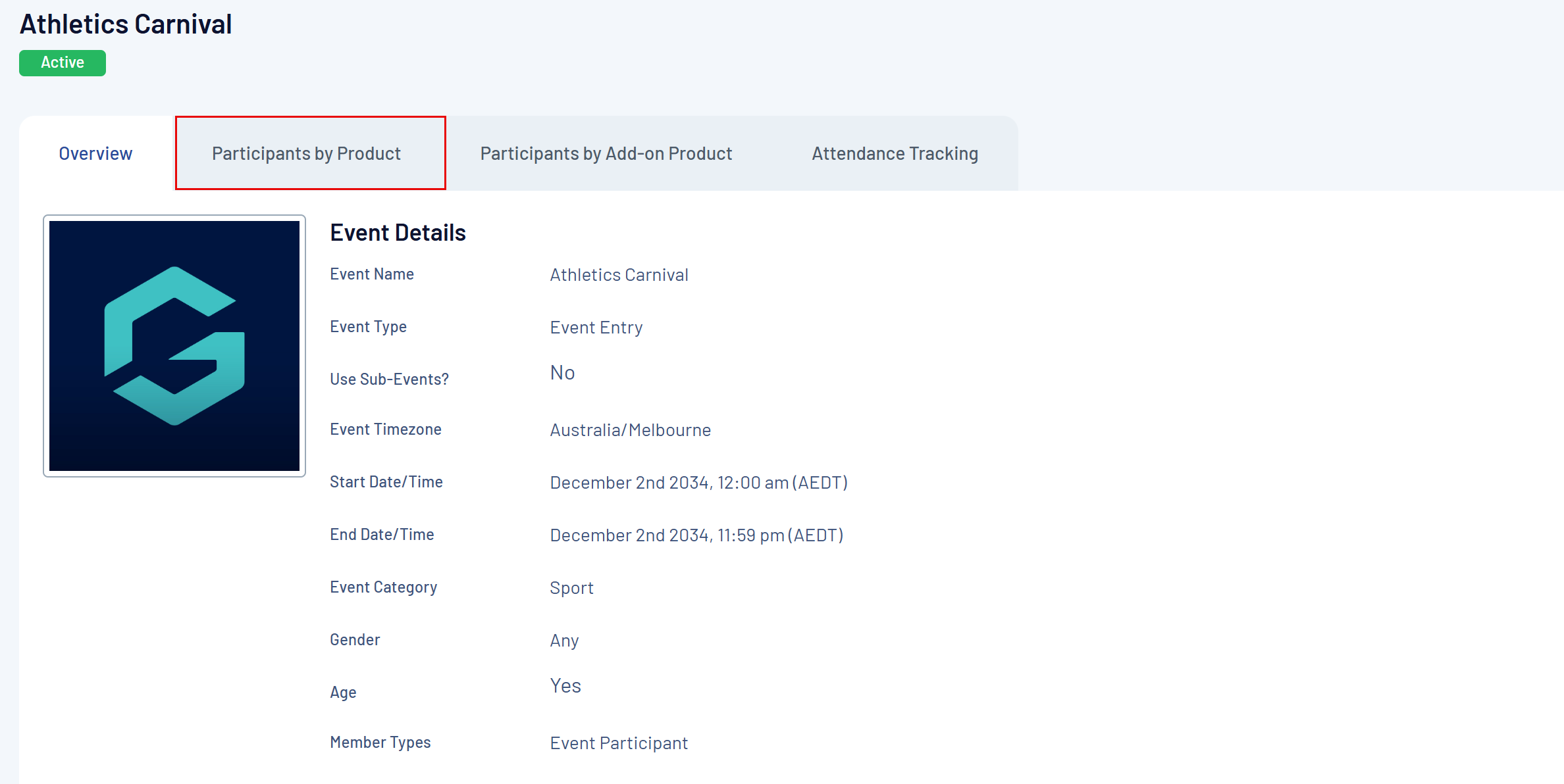 Select the PARTICIPANTS BY PRODUCT tab to open a list of the event's entrants