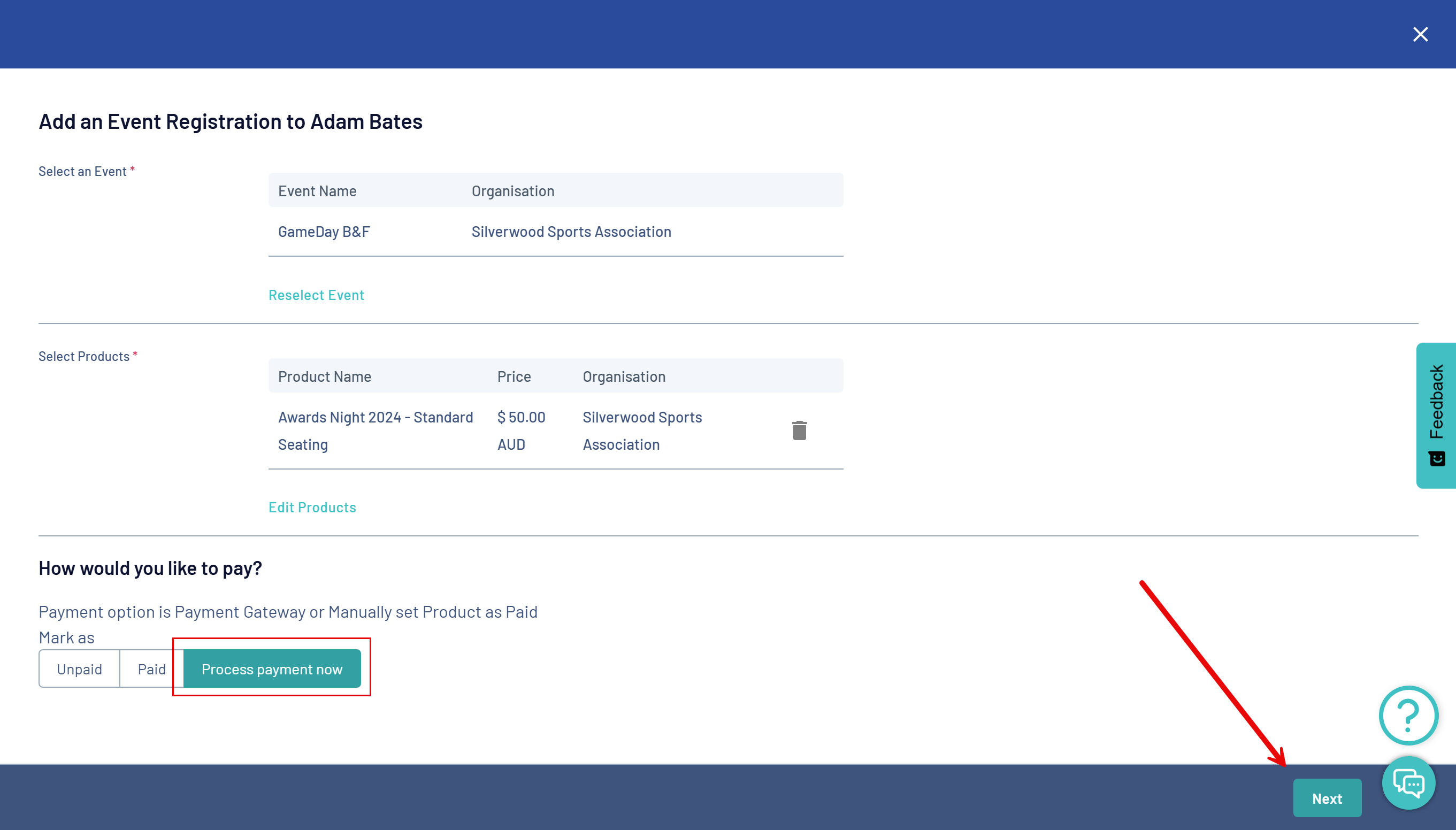 Select an Event and a Product, then choose the Process Payment Now option and click NEXT