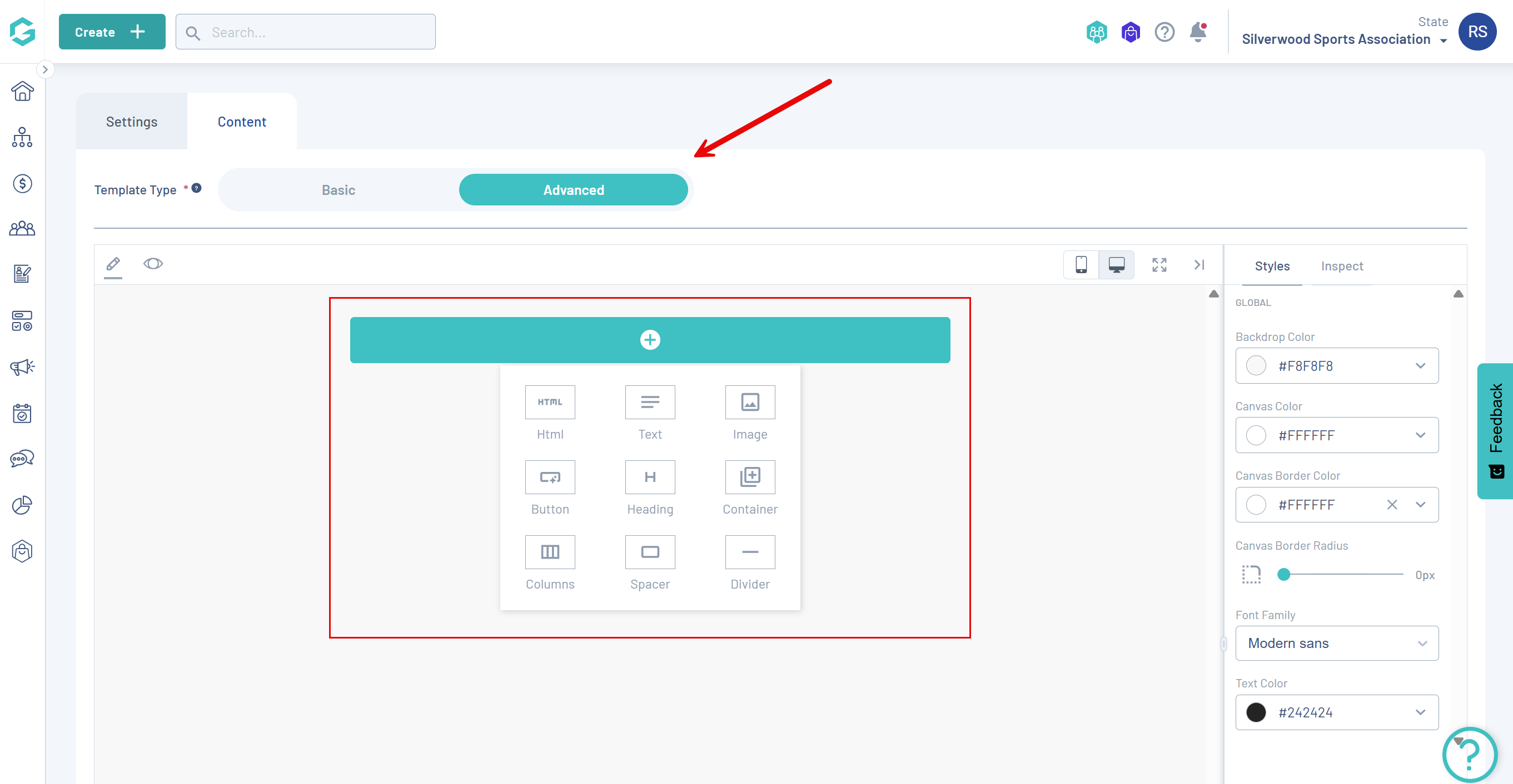 In the Content tab, select ADVANCED as the Template Type, then use the editor provided to add content.