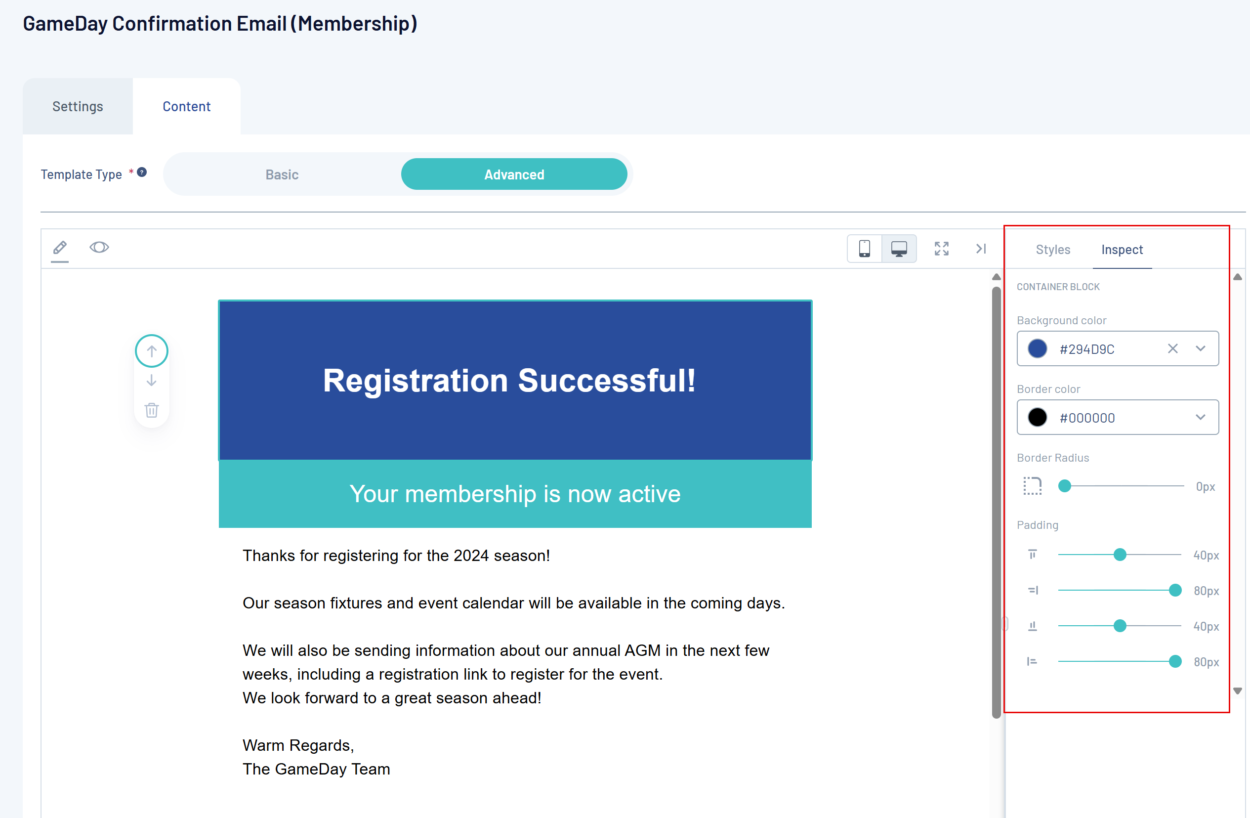 Administrators have the ability to create a custom email template to be used for communication with members or as a custom registration confirmation email for membership forms or events.