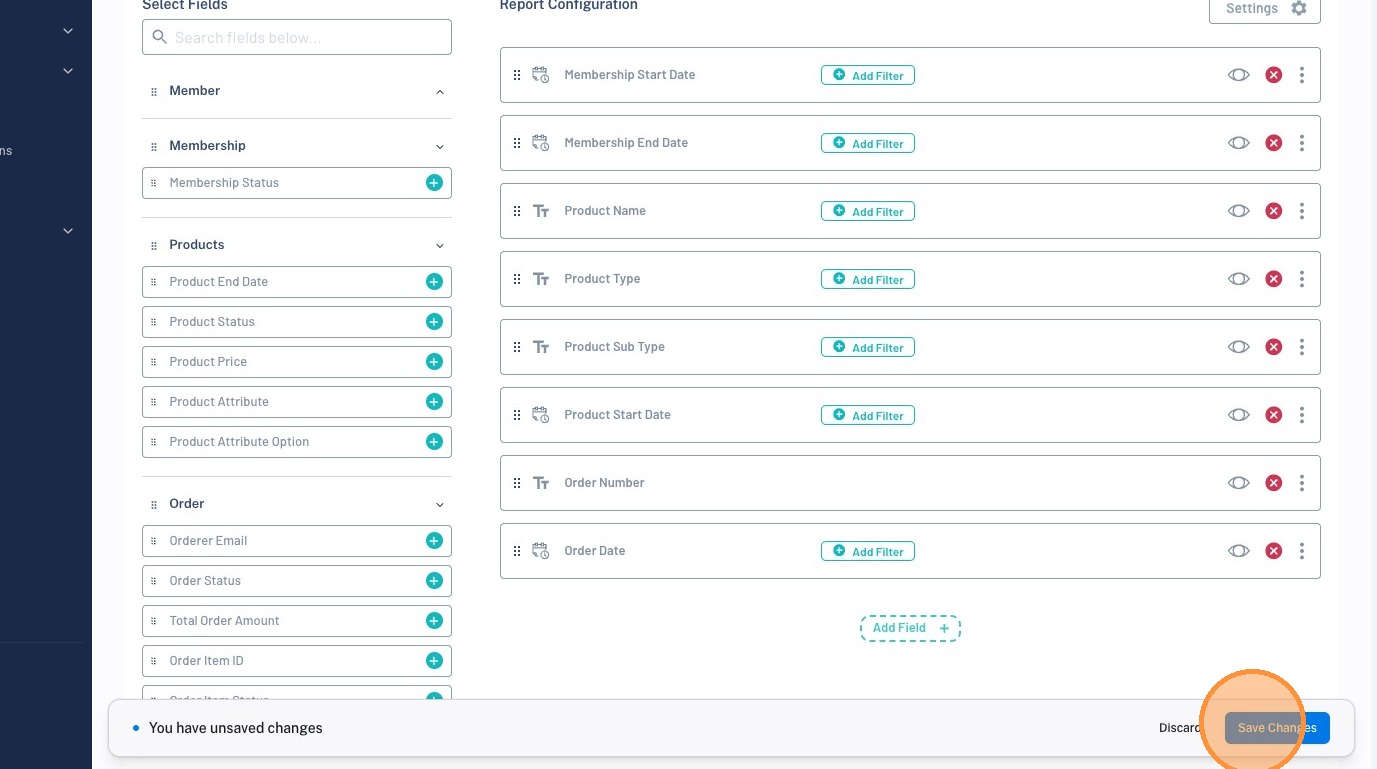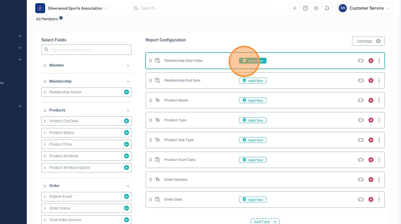 From the report builder page, you can add the fields you wish to report on simply by clicking on the + icon next to the field.