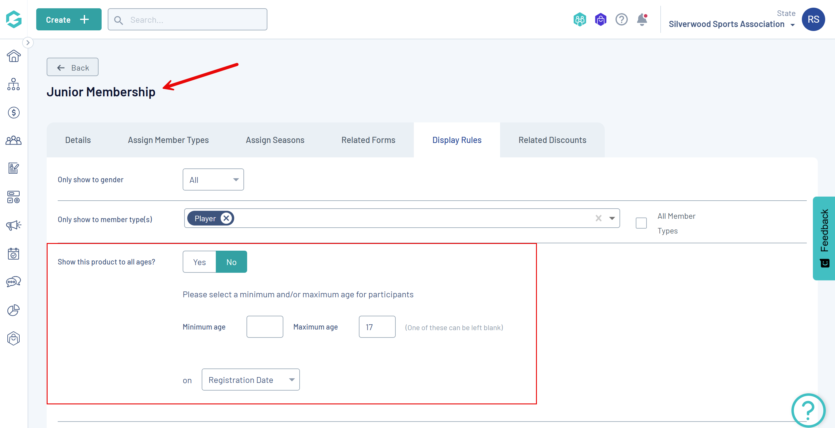 Repeat this process for the Junior Membership product, using the Maximum Age field in your display rule.