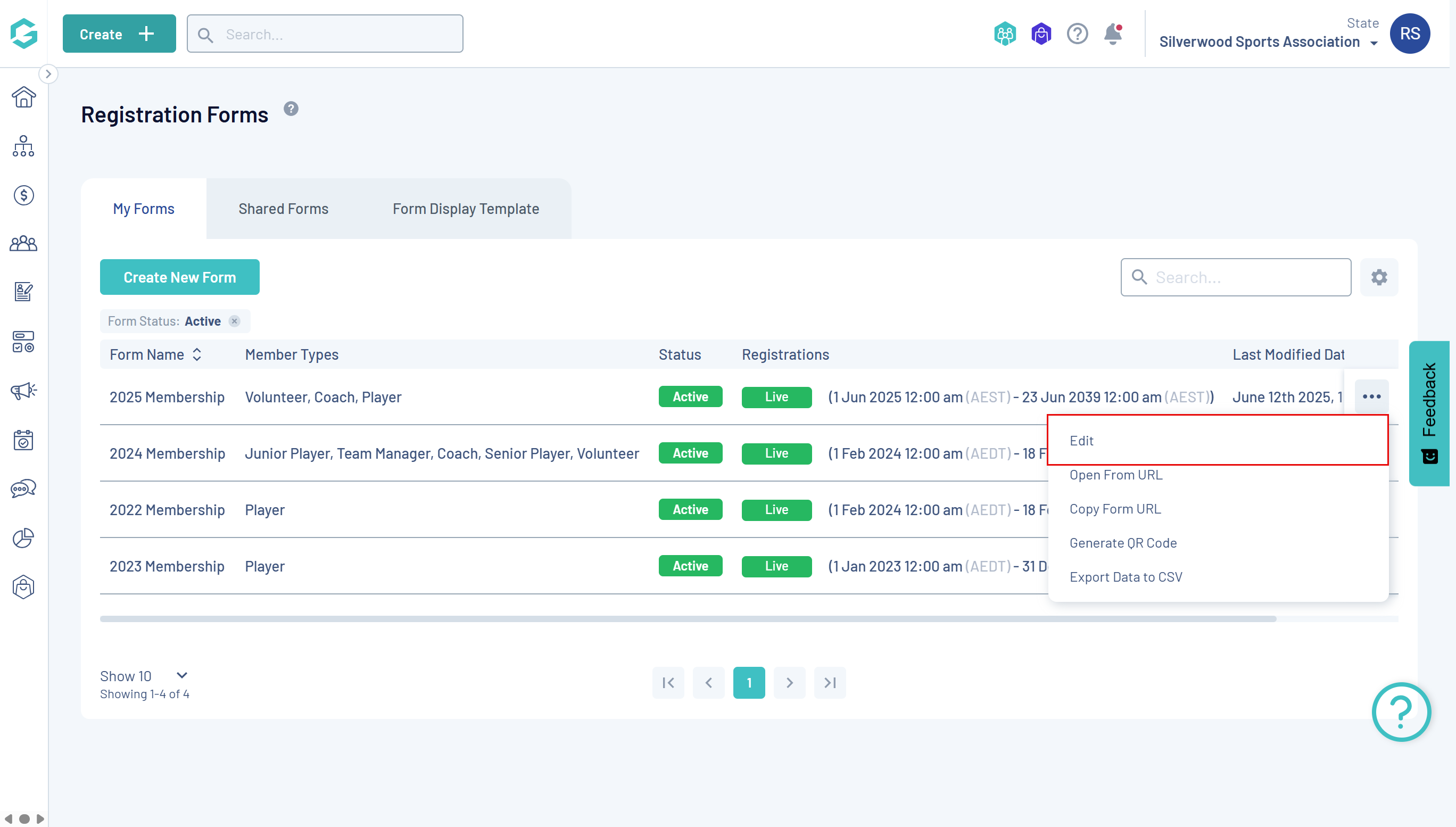 Find the form you want to edit, click the Actions menu, then click EDIT