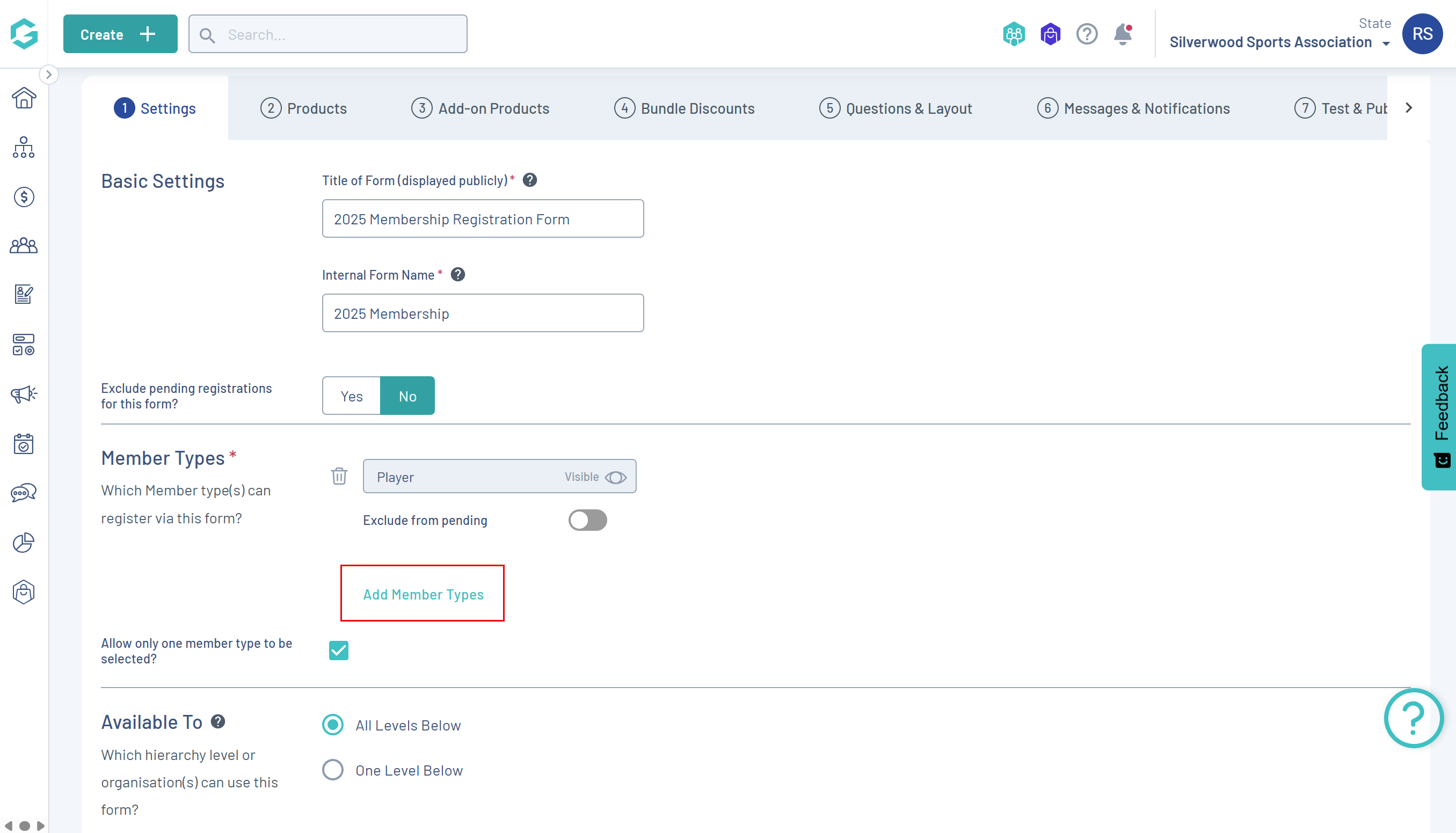 On the Settings tab, find the Member Types section, then click ADD MEMBER TYPES to apply the relevant options to the front page of the form.