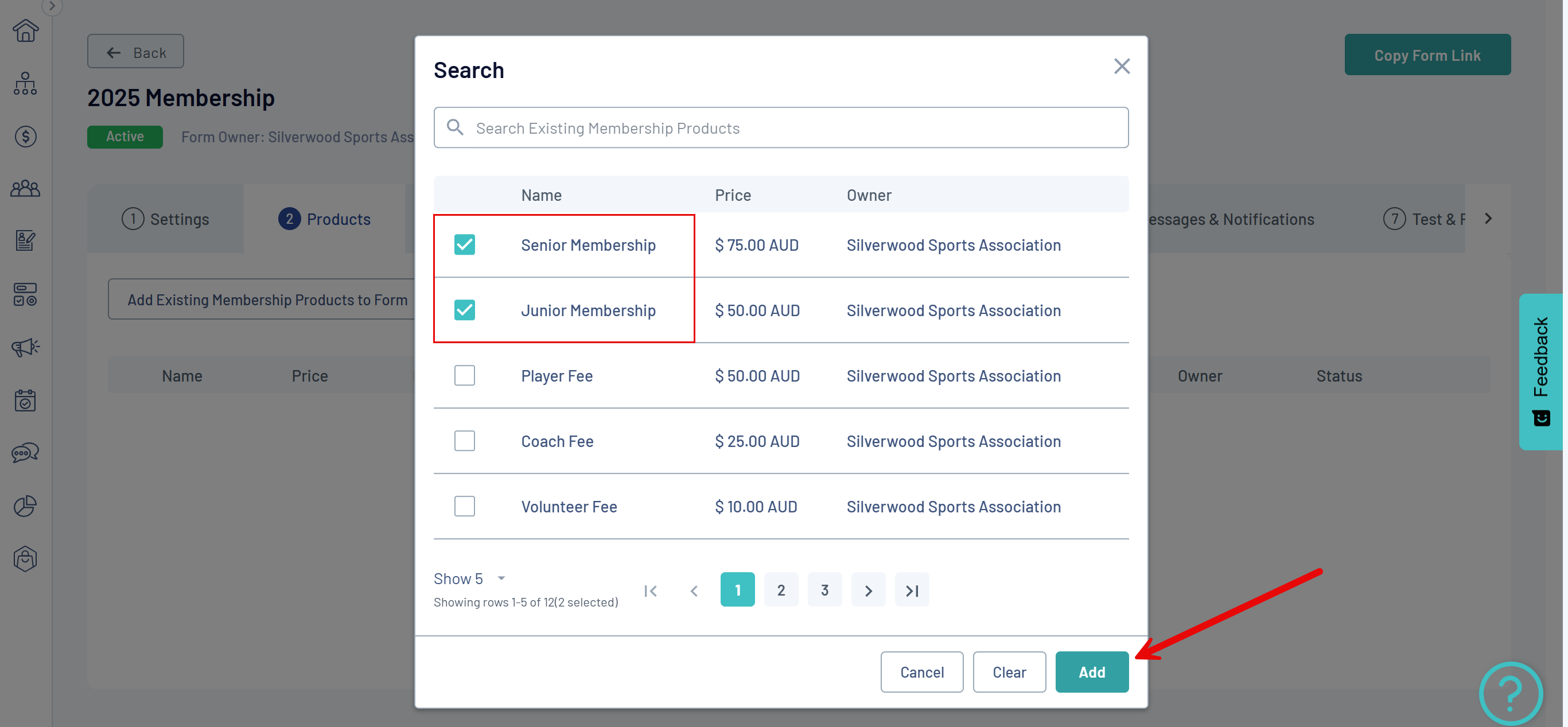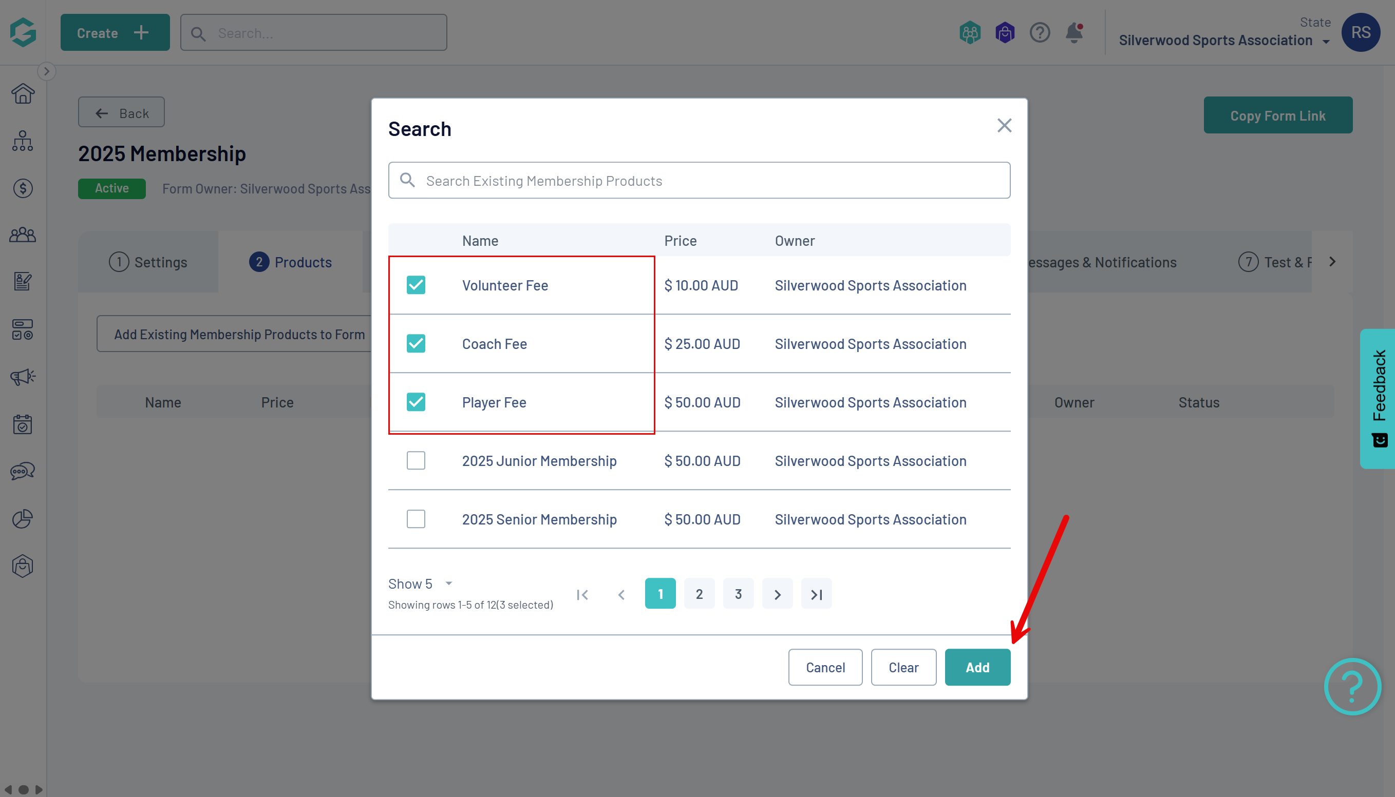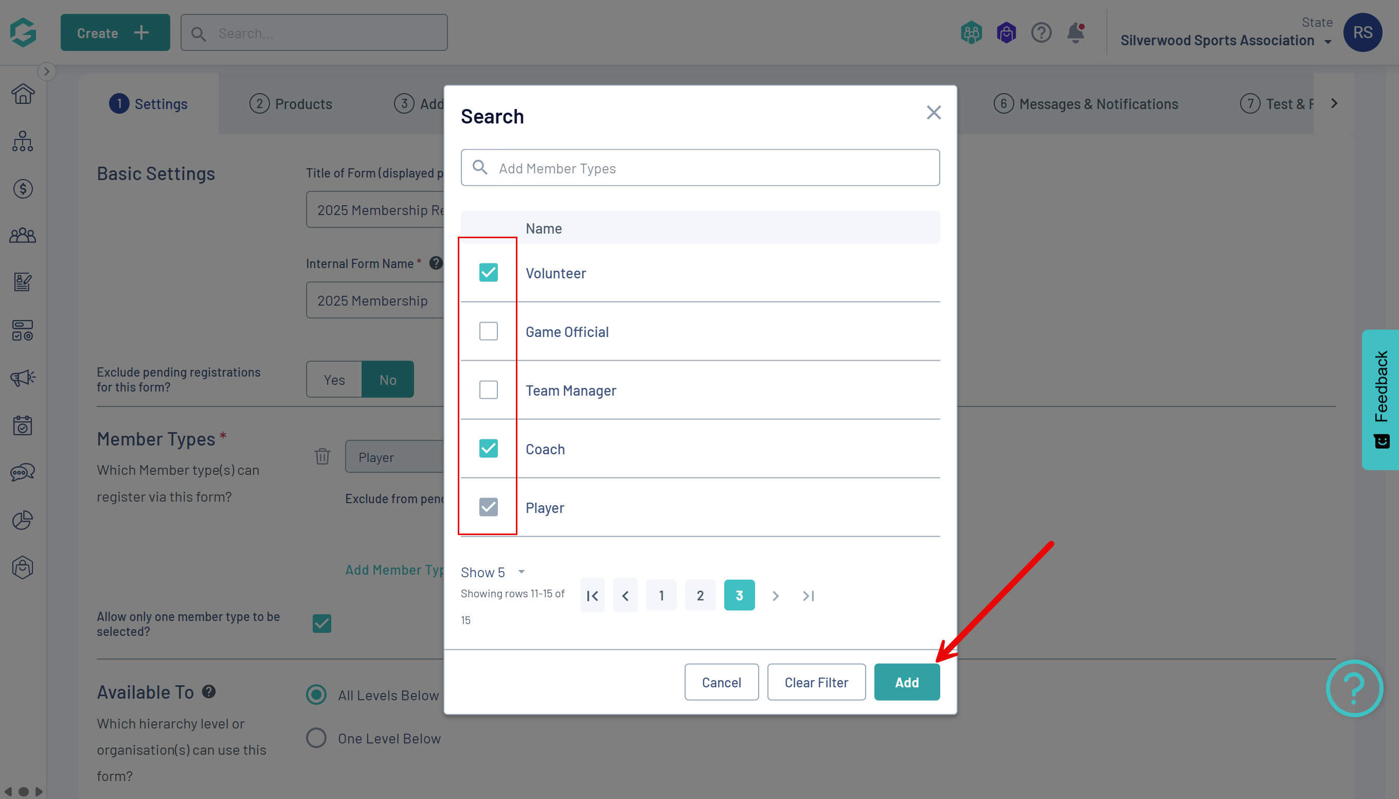 Choose the Player, Coach and Volunteer member types, then click ADD