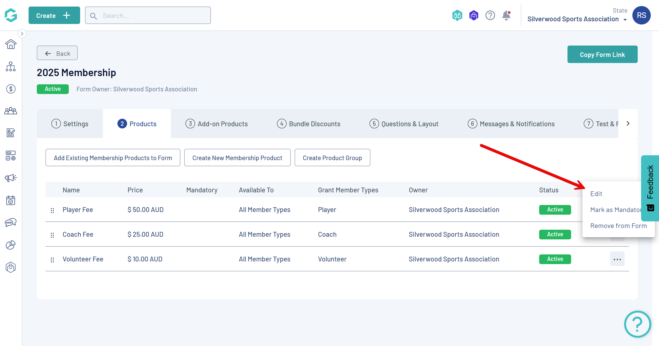 On the Products tab of the form builder, edit the Player product by clicking the Actions menu on the right hand side, then clicking EDIT.