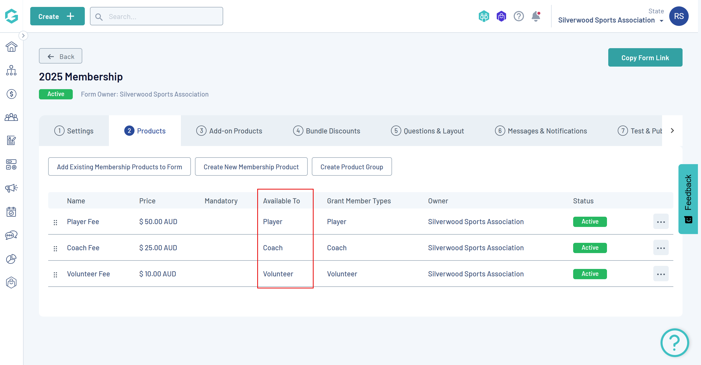 Repeat this process for the other two products. You should then see that the corresponding Member Types appear next to the product in the Available To column when editing the form.