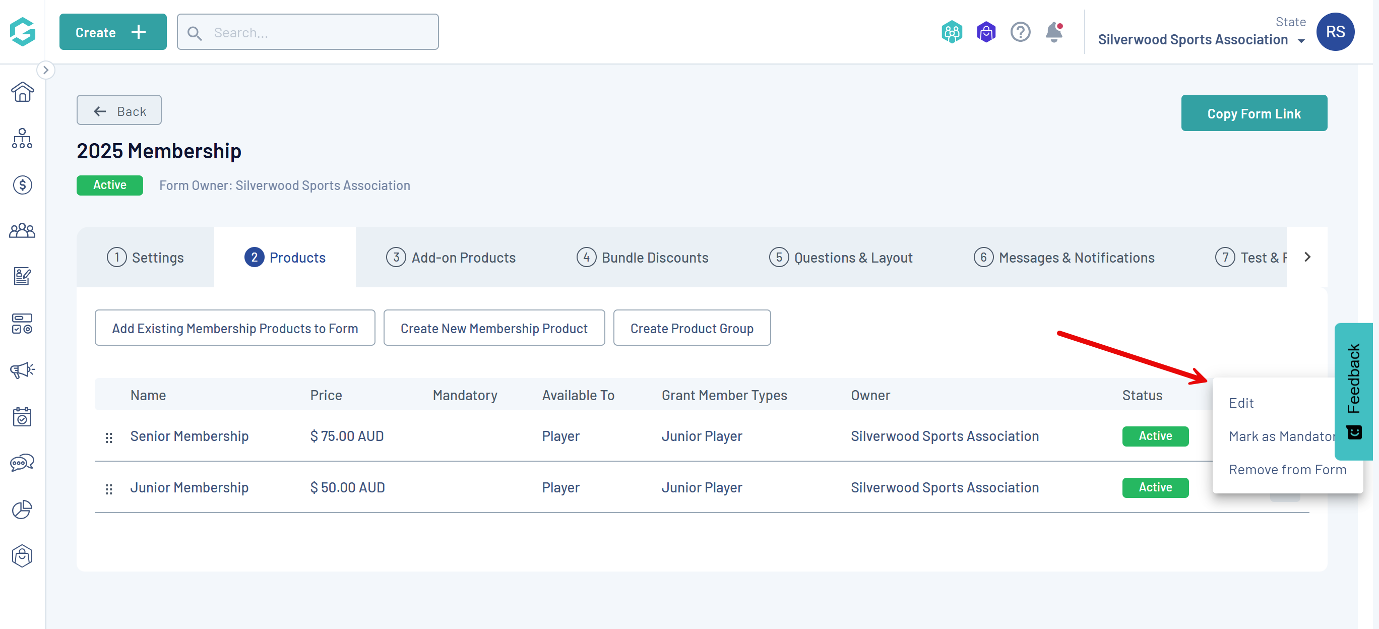 On the Products tab of the form builder, edit the Senior Membership product by clicking the Actions menu on the right hand side, then clicking EDIT.