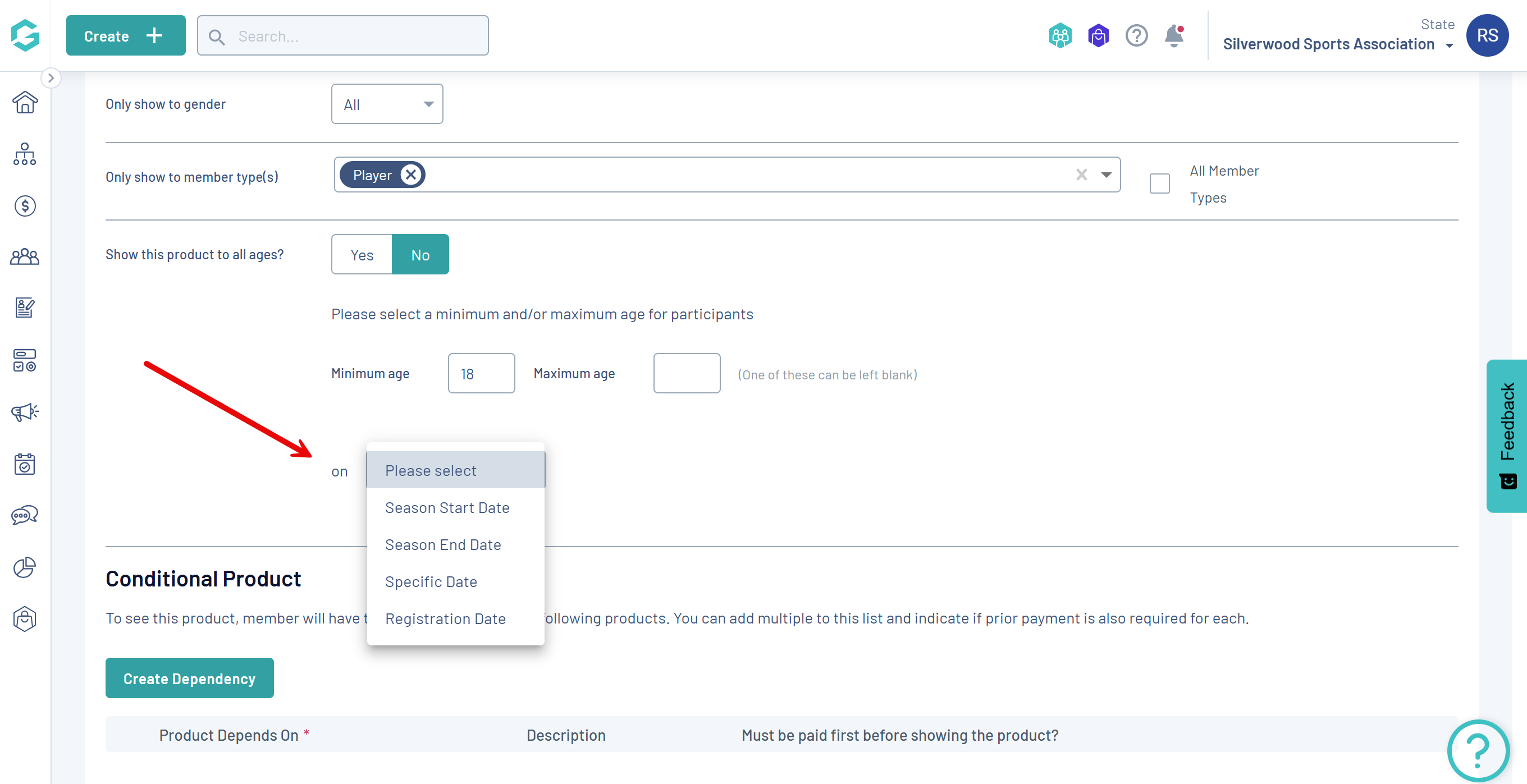 - Season Start Date: Select a season from your database. This option will take the season's start date and only show the product to members who are 18 or older on that date