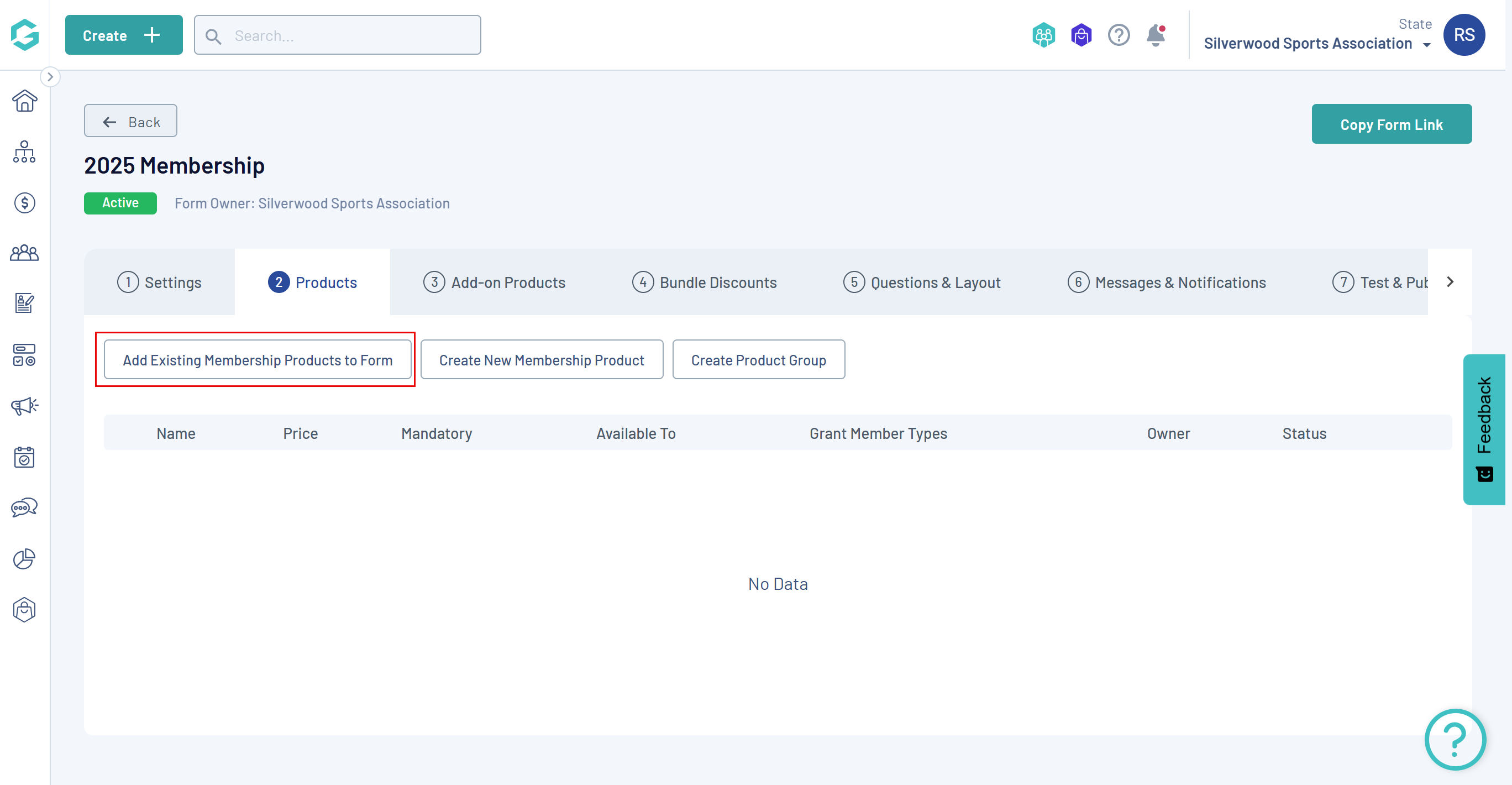 Head to the Products tab of the form builder, then click ADD EXISTING MEMBERSHIP PRODUCTS TO FORM button
