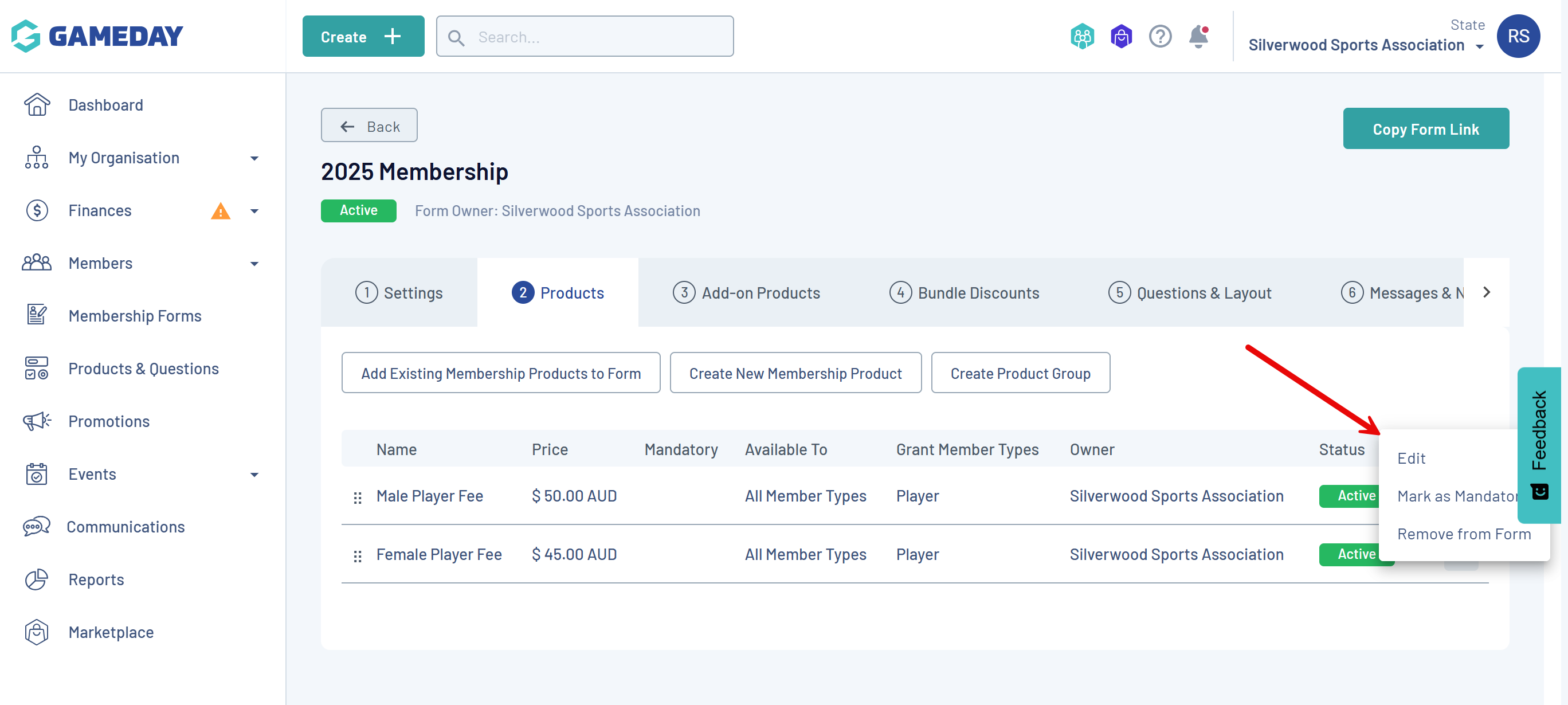 On the Products tab of the form builder, edit the Male Player Fee product by clicking the Actions menu on the right hand side, then clicking EDIT.