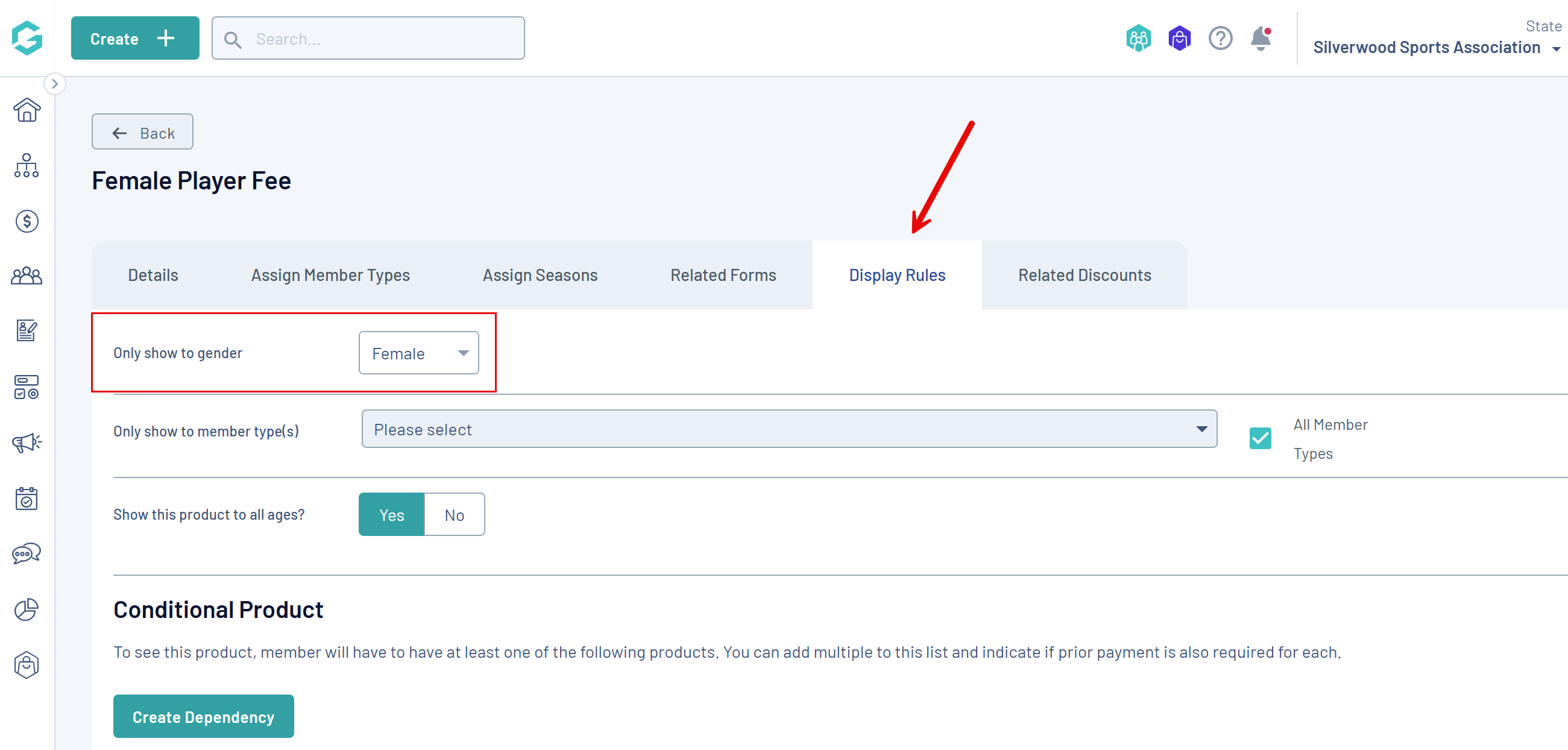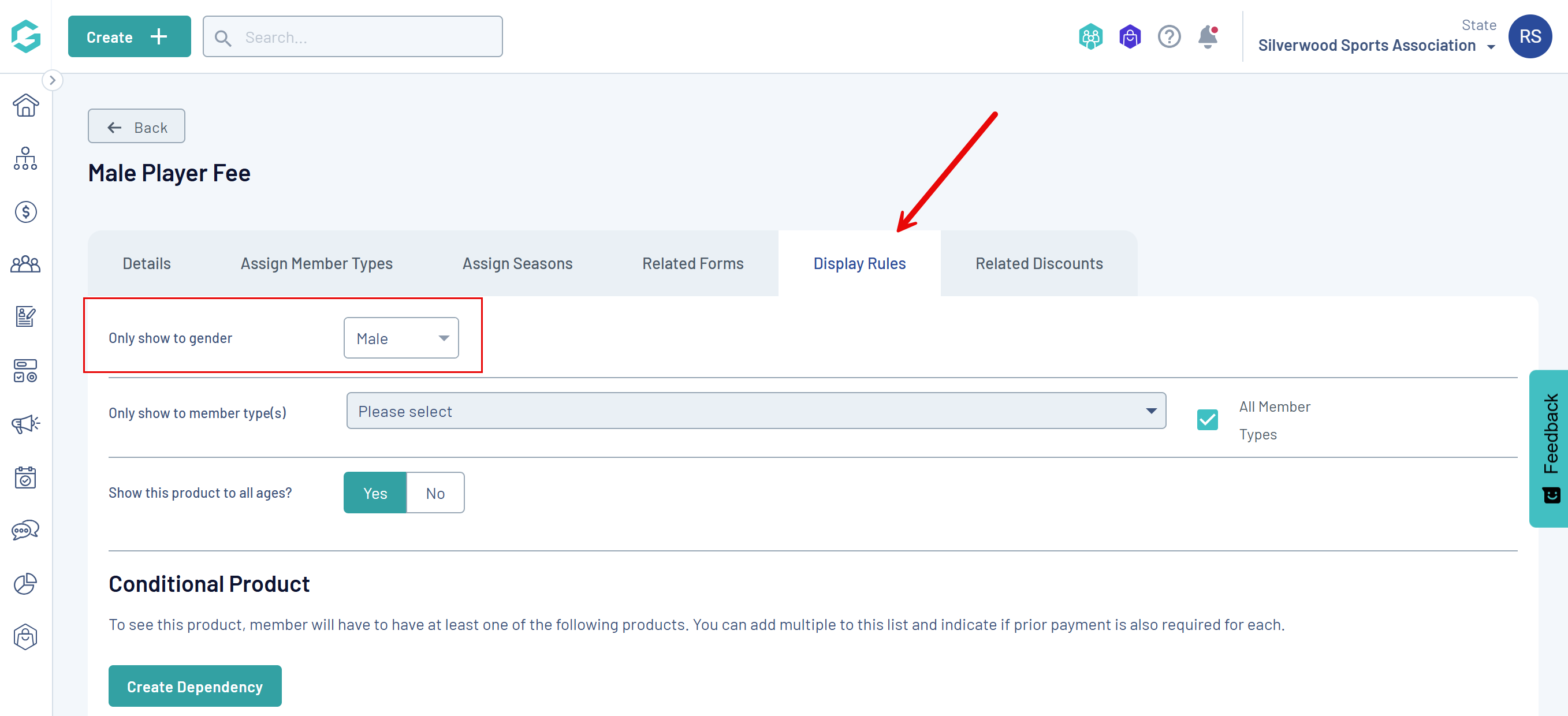 Now, we need to configure our display rules so that the Male Player Fee only shows to members who choose 'Male' as their Gender at Birth on the form, and the equivalent for the Female Player Fee.